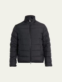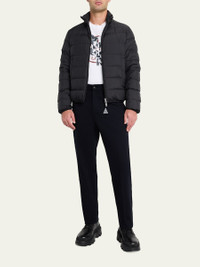 Padded with down/feather fill, the "Baudinet" puffer jacket by Moncler offers a versatile design for everyday warmth Stand collar; twoway zip closure Signature logo patch at left sleeve Long sleeves; elastic cuffs Side zipped pockets Classic fit Midlength Polyester Lining: Polyester Hand wash Made in Romania
