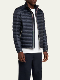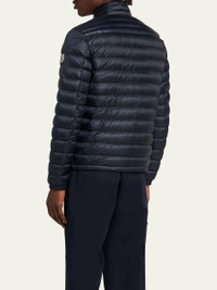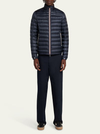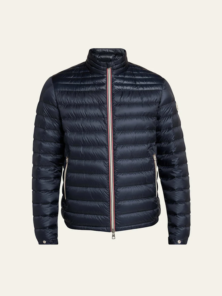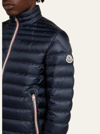 Moncler "Benamou" quilted jacket with signature striped trim Funnel neckline Two-way zip closure Side zip pockets Adjustable snap cuffs Down/feather fill Nylon/polyamide Lining: Nylon Machine wash cold Imported Online Inquiries: BGS21_NCRYE| Store Inquiries: #4939130