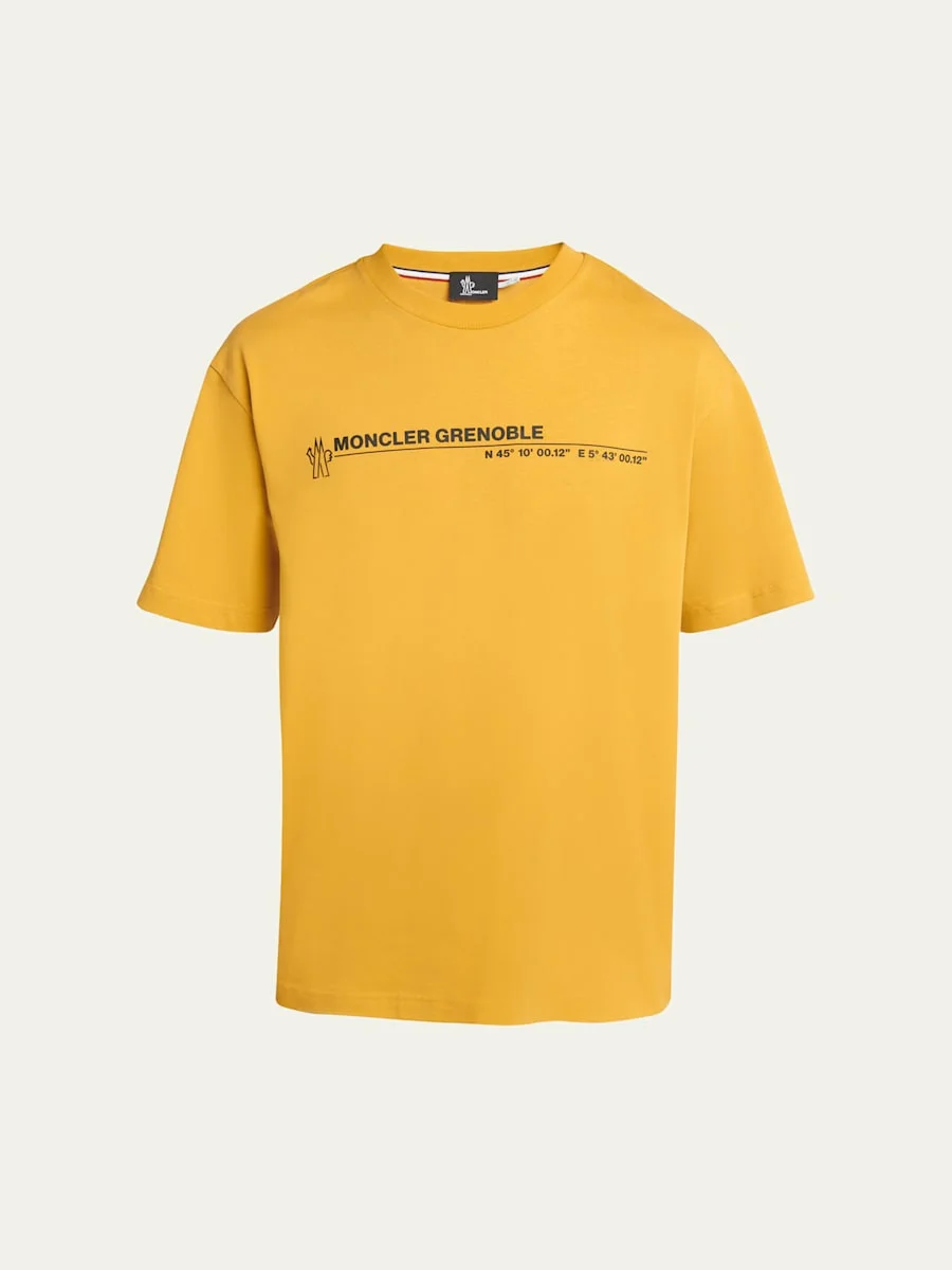 Moncler Grenoble T-shirt featuring a logo print with coordinates at chest Crew neckline Short sleeves Logo patch at back hem Relaxed fit Pullover style Cotton Unlined Machine wash cold Imported Model is 6'1"/185cm. Online Inquiries: BGS21_NC95L| Store Inquiries: #4834642