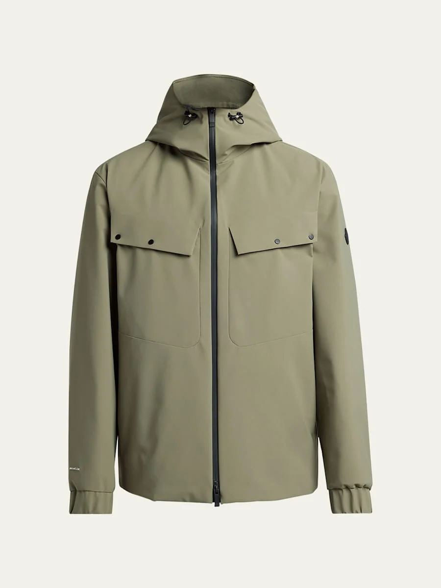 Moncler jacket showcasing a sleek design with modern lines Hooded drawstring neckline Twoway zip front Chest flap pockets Long sleeves Logo on the left sleeve Elasticized cuffs Polyester Professional cleaning recommended Made in Romania