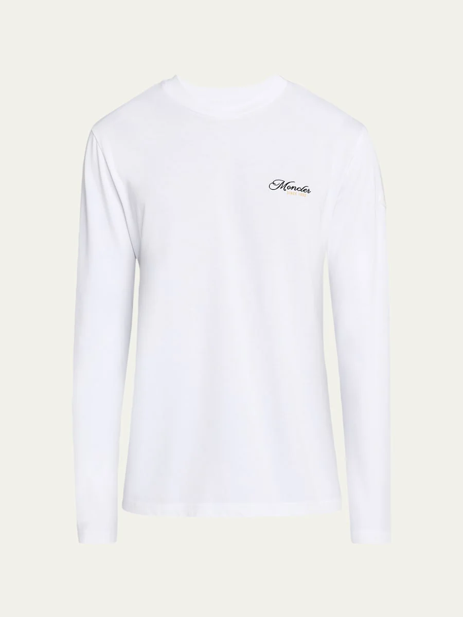 Solid, yet casual, this Moncler longsleeve shirt is accented by logo script on the front and back. Crew neckline Long sleeve Embroidered logo on the left arm Pullover style Cotton Machine wash cold Imported