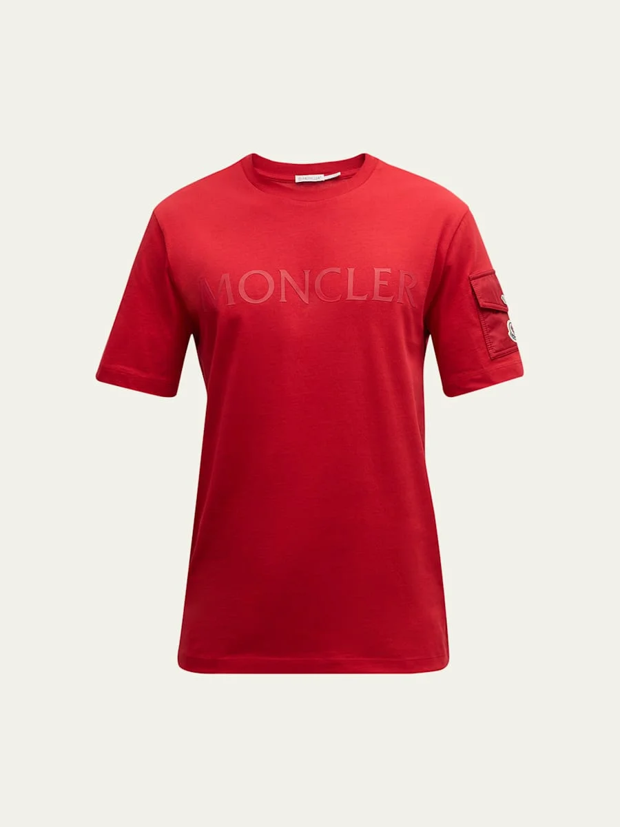 Moncler Tshirt crafted from cotton jersey Laminated embossed logo lettering Crew neckline Short sleeves Nylon sleeve pocket Pullover style Machine wash cold Imported