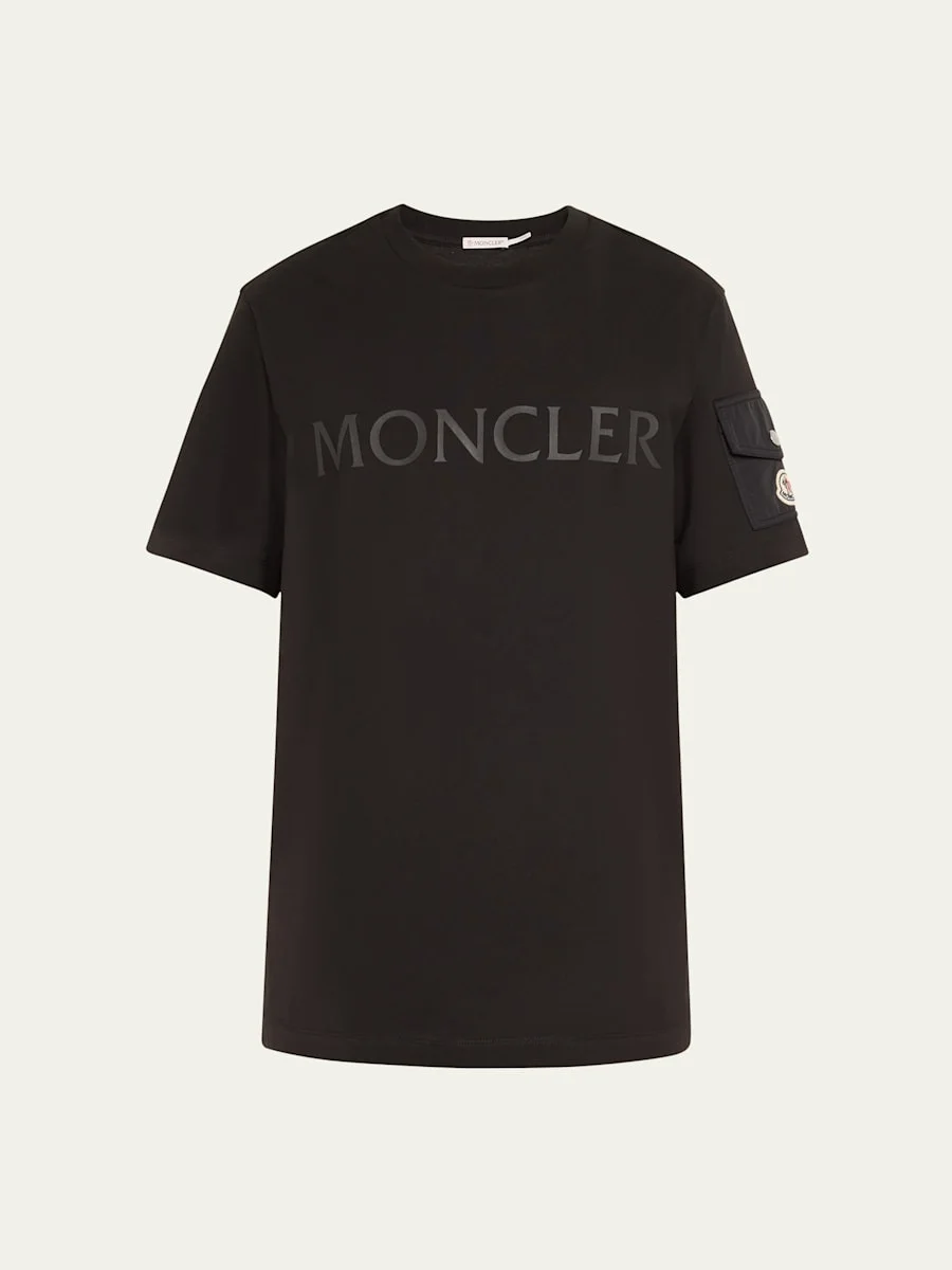 Moncler T-shirt crafted from cotton jersey Laminated embossed logo lettering Crew neckline Short sleeves Nylon sleeve pocket Pullover style Machine wash cold Imported Model is 6'1"/185cm. Online Inquiries: BGS21_NC8XE| Store Inquiries: #4833484