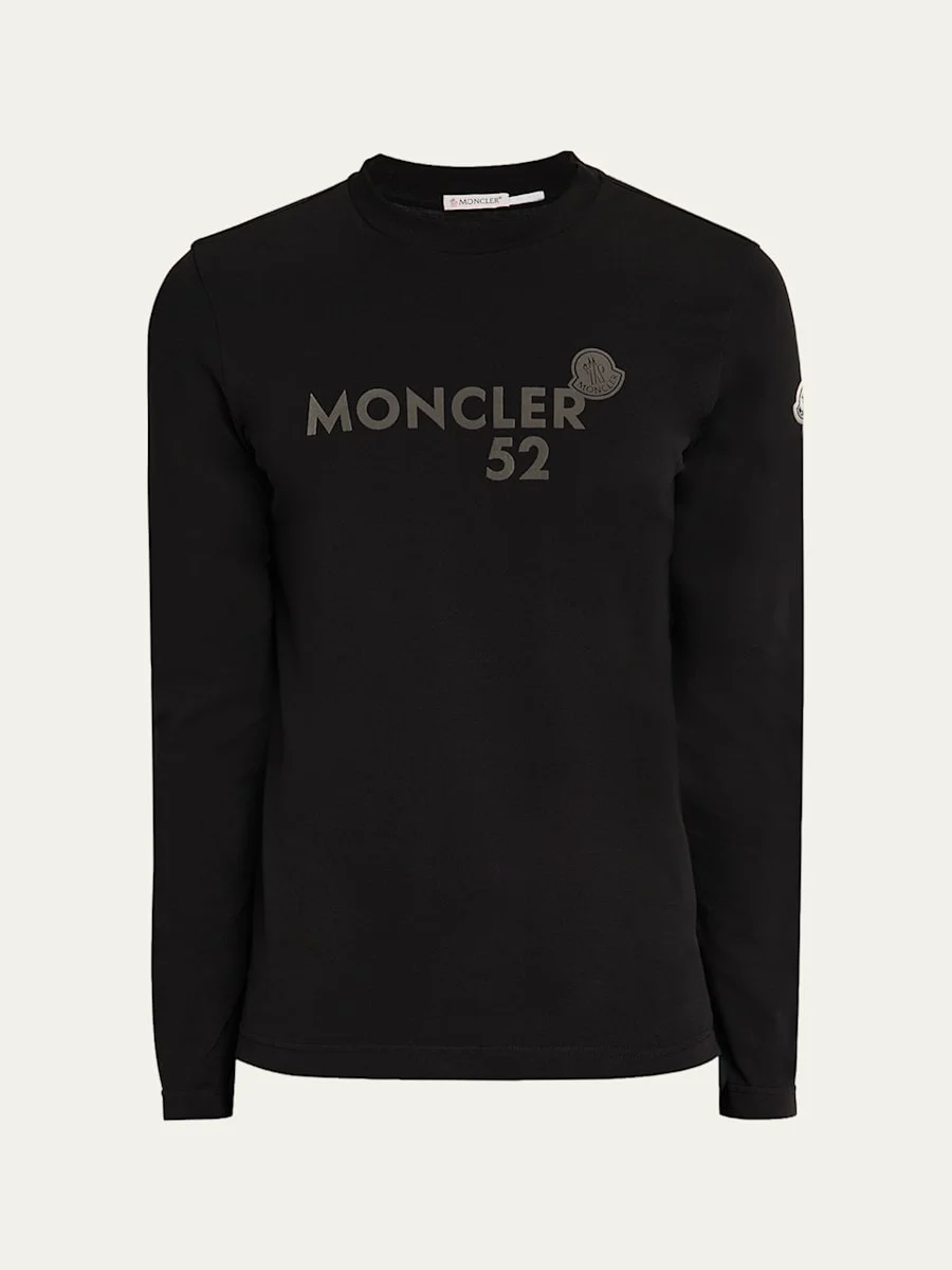 Moncler Tshirt showcasing the iconic logo script on the front Crew neckline Left sleeve logo emblem Long sleeves Pullover style Slim fit Cotton Machine wash cold Imported