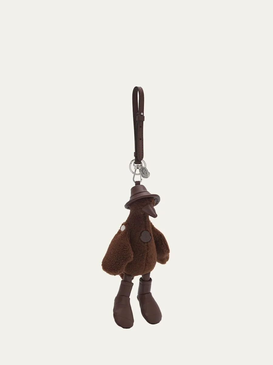 Inspired by the brand's iconic MonDuck character, this Moncler charm features a duck shape crafted from teddy fabric and faux leather. Easily attaches to various bags or keys. Carabiner with adjustable strap Logoengraved metal charm Approx. 8.66" L Polyester/acrylic Made in Italy