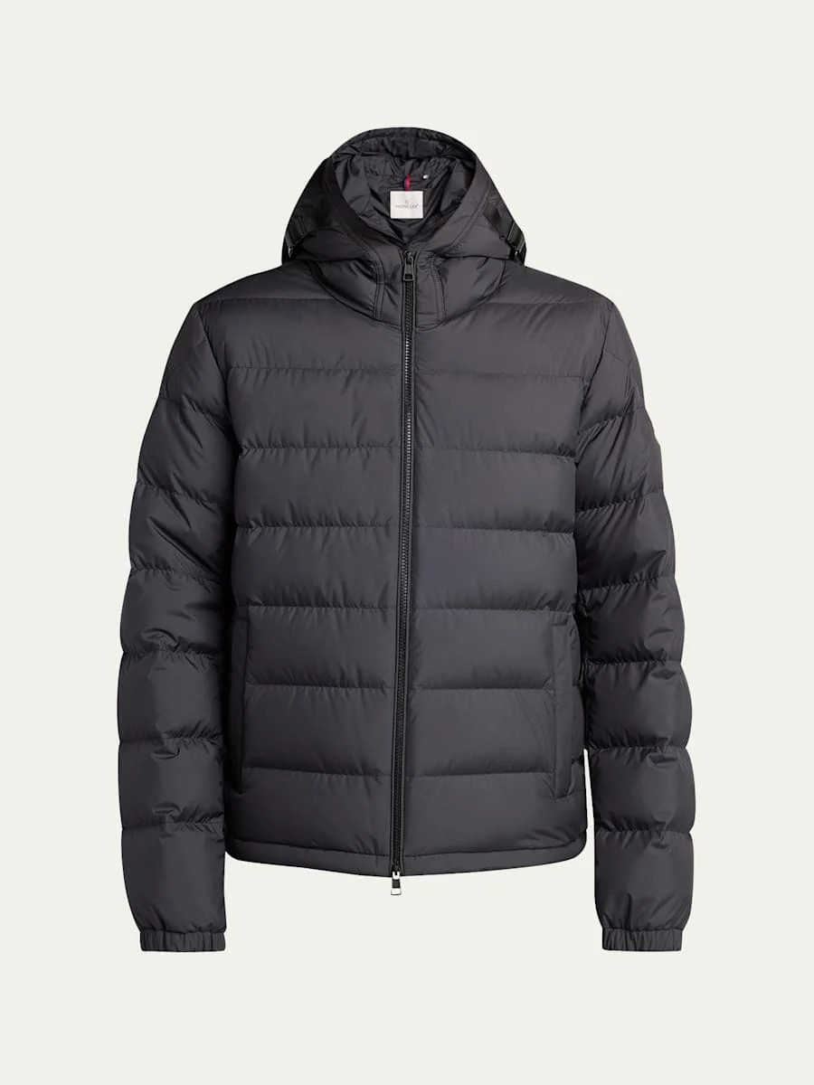 Moncler quilted jacket with premium down/feather fill for lightweight and exceptional warmth Hooded neckline; branded webbing buckle strap Two-way zip front Side welt pockets Long sleeves Logo emblem on the left sleeve Elasticized cuffs Polyester Professional cleaning recommended Imported Online Inquiries: BGS21_NDMHP| Store Inquiries: #5049022