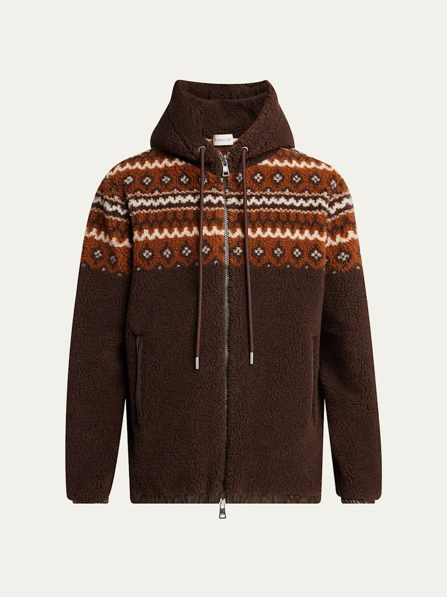 Moncler jacket in ultrasoft boucle fabric accented with a classic Fair Isle pattern Hooded drawstring neckline Twoway zip front Side zip pockets Long sleeves Logo on the left sleeve Elasticized cuffs and hem Polyester/virgin wool Professional cleaning recommended Made in Romania