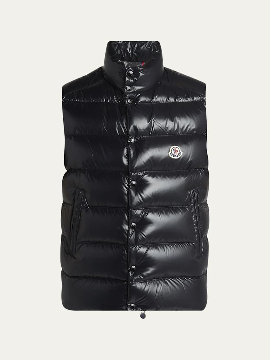 Moncler vest in soft nylon elevated with down/feather padding for added warmth Signature logo emblem on the chest Funnel neck Snap front Side besom pockets Sleeveless Nylon Lining: Nylon Machine wash cold Imported