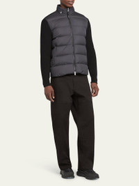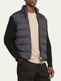 Moncler knit jacket featuring a padded front and zip-hideable hood Stand collar; two-way zip front Long sleeves Ribbed cuffs Side welt pockets Polyester/virgin wool Lining: Polyester Fill: Down/feather Partial lining Dry clean Imported Model is 6'1"/185cm. Online Inquiries: BGS21_NC90H| Store Inquiries: #4833629