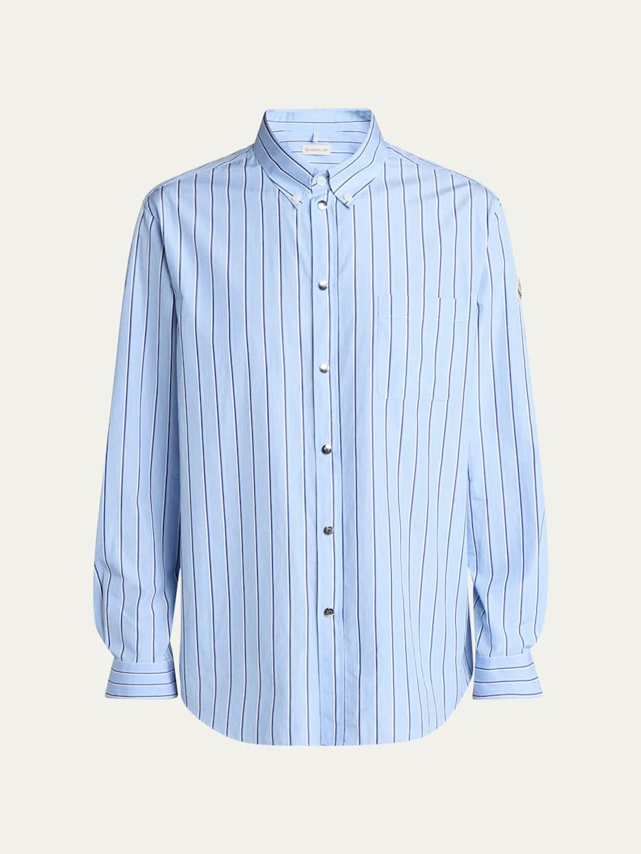 Moncler sport shirt in crisp wool highlighted with vertical multistripes Buttondown collar Button placket Chest patch pocket Long sleeves Logo emblem on the left sleeve Round barrel cuffs Pleated back yoke Shirttail hem Virgin wool Lining: Polyester Professional cleaning recommended