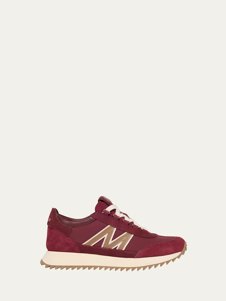 Moncler "Pacey2" lowtop sneakers crafted from nylon, suede, and nubuck with a bold monogram accent 1.25 in / 30 mm flat heel Round toe Laceup vamp Padded collar Rubber outsole Nylon mesh lining Made in Italy
