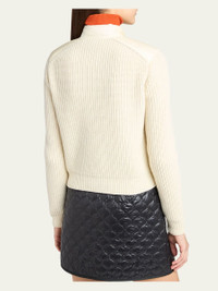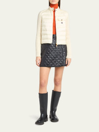 Moncler soft merino woolblend cardigan finished with downfilled padded front for added warmth Stand collar with snap closure Long sleeves Side zip pockets Chest pocket with signature embroidered logo patch Slim fit Adjustable drawstring hem Twoway zipfront Virgin wool/cashmere/nylon/polyamide Lining: Nylon Fill: Down/feather Professional cleaning recommended Imported