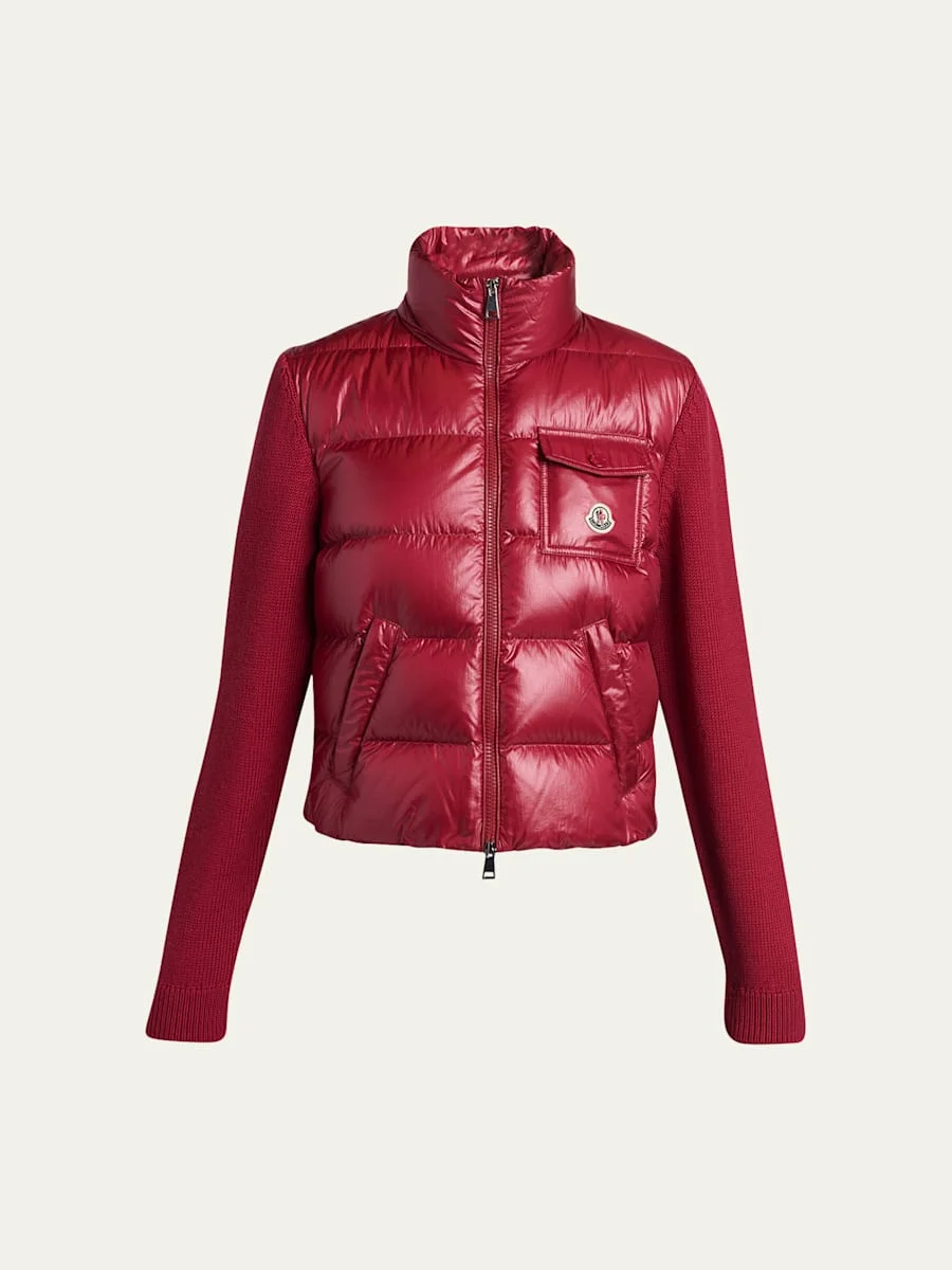 Featuring a combo silhouette, this Moncler cardigan boasts a padded nylon bodice finished with wool knit sleeves for a classic silhouette. Signature embroidered logo patch on the chest Stand collar Long sleeves Welt pockets; chest flap pocket Classic fit Hem sits at the hip Twoway zipfront Cotton/elastane/wool Fill: Down/feather Dry clean Made in Italy