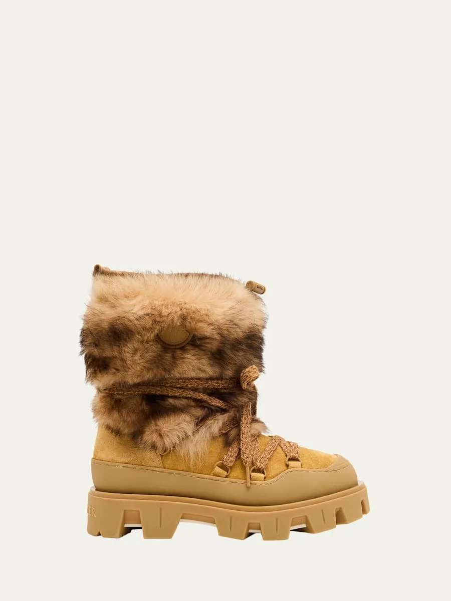 Defined by bold aesthetics and performance-driven details, the "Peak Apres" ankle boots from Moncler are crafted from suede with dyed long-haired lamb shearling (Italy) accents 1.75 in / 45 mm flatform heel Flat heel Round toe Wraparound lace-up vamp Adjustable drawcord at collar Pull-tab at backstay Mesh and neoprene insole Rubberized TPU outsole with EVA filler Made in Italy Online Inquiries: BGS21_X7CQZ| Store Inquiries: #5057238