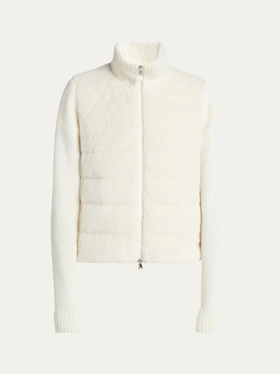 Moncler combo cardigan featuring a quilted faux fur bodice finished with knit trim Stand collar Long sleeves Embroidered logo patch at left sleeve Classic fit Hem sits at the hip Two-way zip-front Polyester/virgin wool Lining: Nylon Professional cleaning recommended Imported Online Inquiries: BGS21_T6ADS| Store Inquiries: #4944260