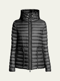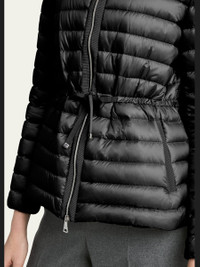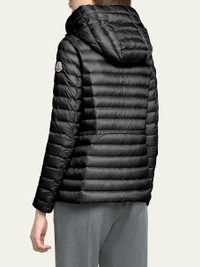 Moncler "Raie" puffer parka jacket crafted from nylon leger with grosgrain details to enhance its feminine silhouette Hooded neckline; adjustable drawstring fastening Two-way zipper closure Long sleeves Logo patch at left sleeve Adjustable drawstring waistband Welt pockets with zipper closures Regular fit Nylon/polyamide Lining: Nylon leger Fill: Feather/Down Made in Romania Model is 5'10"/177cm. Online Inquiries: BGS21_T91LW| Store Inquiries: #4830260