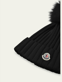 Moncler ribbed wool beanie with faux fur pom Folded cuff with embroidered logo patch Virgin wool Professional cleaning recommended Imported Online Inquiries: BGS21_D53MD| Store Inquiries: #4939264