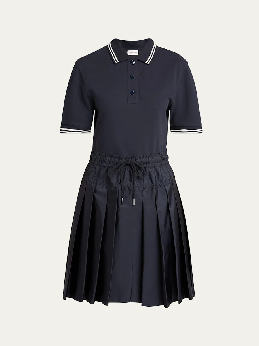 Moncler mixed-media polo dress finished with pleating Point collar; button-placket Short sleeves Signature embroidered logo patch at left sleeve Adjustable drawstring waist A-line silhouette Hem falls above the knee Slipover style Cotton/nylon/polyamide Imported Online Inquiries: BGS21_T6WG4| Store Inquiries: #5051046