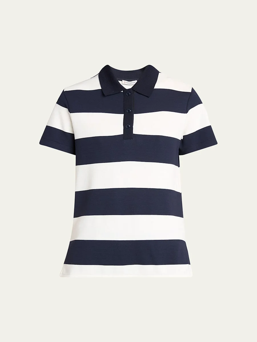 Moncler wide stripe polo shirt finished with embossed logo buttons Point collar; buttonplacket Short sleeves Embroidered logo patch at left sleeve Classic fit Hem falls to the hip Pullover style Viscose/nylon/polyamide/elastane Unlined Professional cleaning recommended Made in Italy