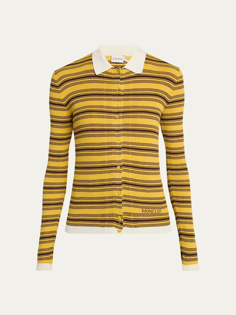 Moncler striped polo cardigan crafted from ultrasoft ribbed knit and finished with contrast trim Features logo embroidery along the hem Spread collar Long sleeves Slim fit Hem sits at the hip Buttonfront Cotton Machine wash cold Imported
