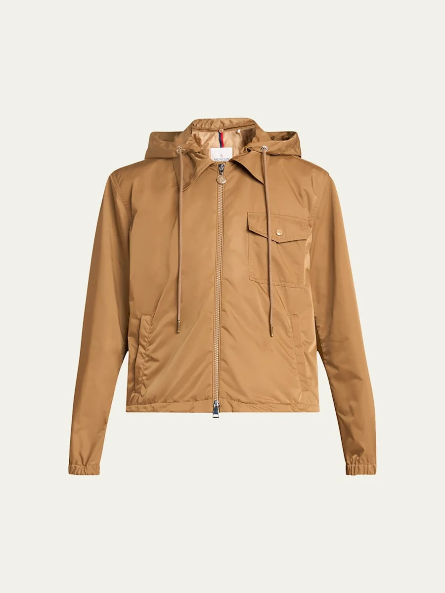 Moncler "Vallery" windbreaker jacket crafted from recycled polyester Removable, adjustable drawstring hood Long sleeves with elastic cuffs Embroidered logo patch at left sleeve Chest flap pocket Side zip pockets Relaxed fit Twoway zipfront Polyester Lining: Polyester Hand wash Imported