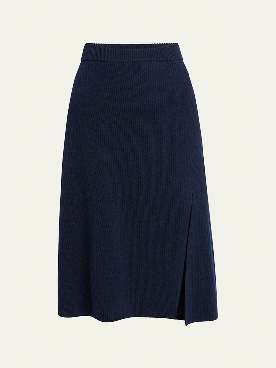 Moncler midi skirt crafted in a luxurious woolcashmere blend High rise Elastic waistband Tonal silicone logo patch Aline silhouette Thighhigh slit Pullon style Virgin wool/cashmere Unlined Professional cleaning recommended Made in Italy