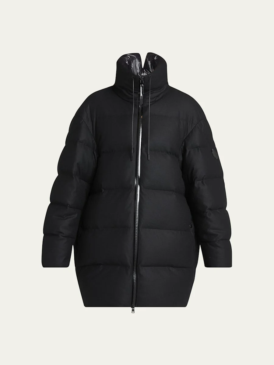 Crafted from signature longue saison with a waterrepellent finish, the "Maarutha" downfilled coat from the Moncler Genius and Edward Enninful collaboration collection features an oversized silhouette that seamlessly fuses technical performance with comfort. Features a signature tonal logo patch on the left sleeves Stand collar with adjustable drawstrings Dropped shoulders Long sleeves Relaxed, cocoonstyle fit Midthigh length Twoway zipfront Wool/nylon/polyamide Fill: Feather/down Lining: Nylon Machine wash cold Imported