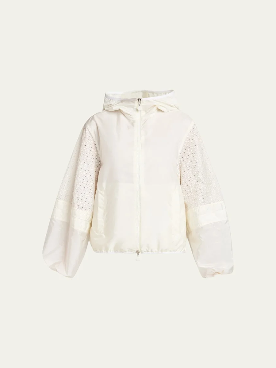 Adorned with perforated eyelet detailing, the "Zelkova" jacket by Moncler is crafted from a technical fabric and features a hooded neckline. Features a signature embroidered tonal logo patch on the left sleeve Dropped shoulders Long sleeves with elastic cuffs Slip pockets Relaxed fit Hem falls to the hip Twoway zipfront Nylon/polyamide/polyester Partially lined Hand wash or dry clean Made in Italy
