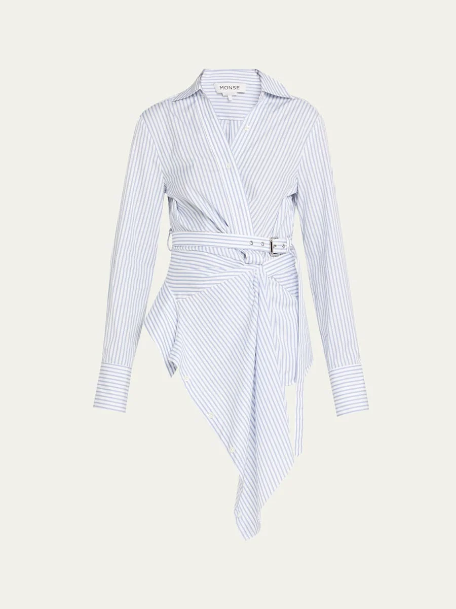 Monse wrap blouse featuring a striped print, a belted waist, and an asymmetric hem Approx. 43.5"L from shoulder to hem V nekcline; spread collar Long sleeves; button cuffs Slim fit Hem falls below the hip Button closure Cotton Imported Online Inquiries: BGS21_BA5P4| Store Inquiries: #5039993