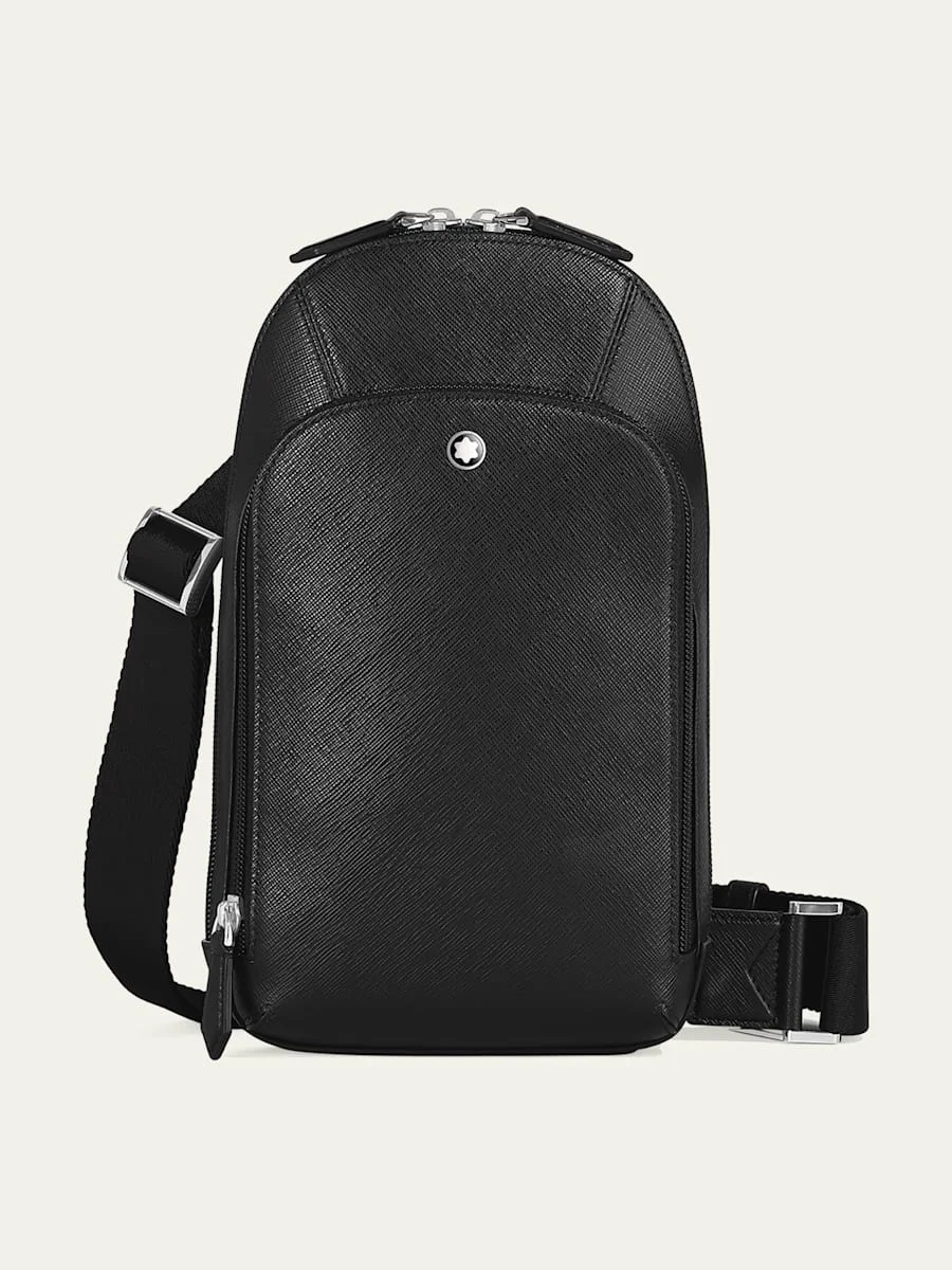 Montblanc "Sartorial" sling bag in saffiano-embossed leather Logo emblem on the front Adjustable shoulder strap Double zip closure Exterior, one front zip pocket Interior, one main compartment, one zip pocket, three open pockets, three card slots Approx. 11.6"H x 6.7"W x 2.4"D Spot clean Made in Italy Online Inquiries: BGS21_ND05R| Store Inquiries: #4987812