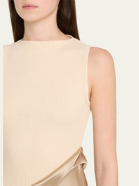 Nanushka "Cobee" combo dress featuring a ribbedjersey bodice finished with a satin skirt High neckline Sleeveless Draped waist sash Slip silhouette Full length Slipover style Triacetate/polyester/cotton Machine wash warm or dry clean Imported