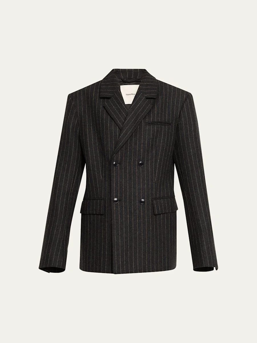Tailored in pinstripe wool, the "Osono" blazer by Nanushka boasts a boxy silhouette for a fresh take on classic suiting. Notch lapels Doublebreasted front Structured shoulders Long sleeves with button cuffs Chest welt pocket Hip flap pockets Back vent Buttonfront Wool/nylon/polyamide/viscose Dry clean Imported