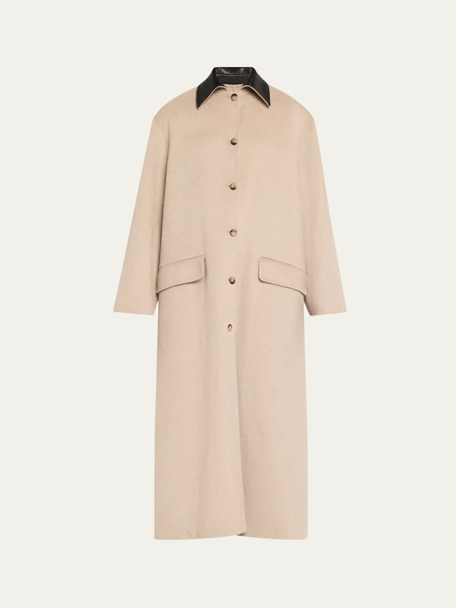 Crafted from double wool, the "Rowina" coat by Nanushka boasts a contrasting regenerated leather collar and is designed for a cozy, oversized look. Spread collar Singlebreasted front Long sleeves Hip flap pockets Relaxed fit Full length Buttonfront Wool/silk/polyester Dry clean Imported