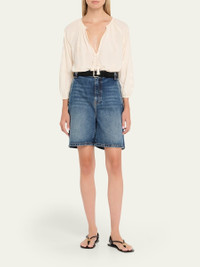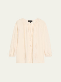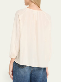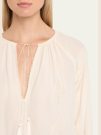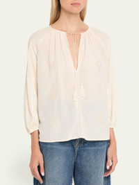 Nili Lotan "Cristo" embroidered silk blouse V neckline with tassel ties Three-quarter raglan sleeves Loose fit Hem falls to the hip Pullover style Silk Made in USA from imported materials Online Inquiries: BGS21_B9RWA| Store Inquiries: #4952900