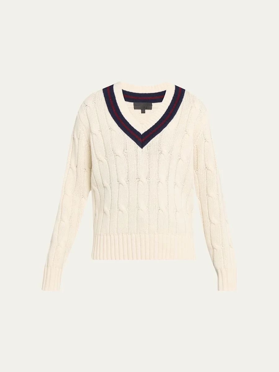 Crafted from warmwool cable knit, the "Fabiana" sweater from Nili Lotan features a varsityinspired strip neckline intarsia V neckline Long sleeves Relaxed fit Hip length Ribbed cuffs and hem Pullover style Wool Dry clean Imported SIZE amp; FITModel measurements: 5'10" tall Model is wearing a US size 4/Small