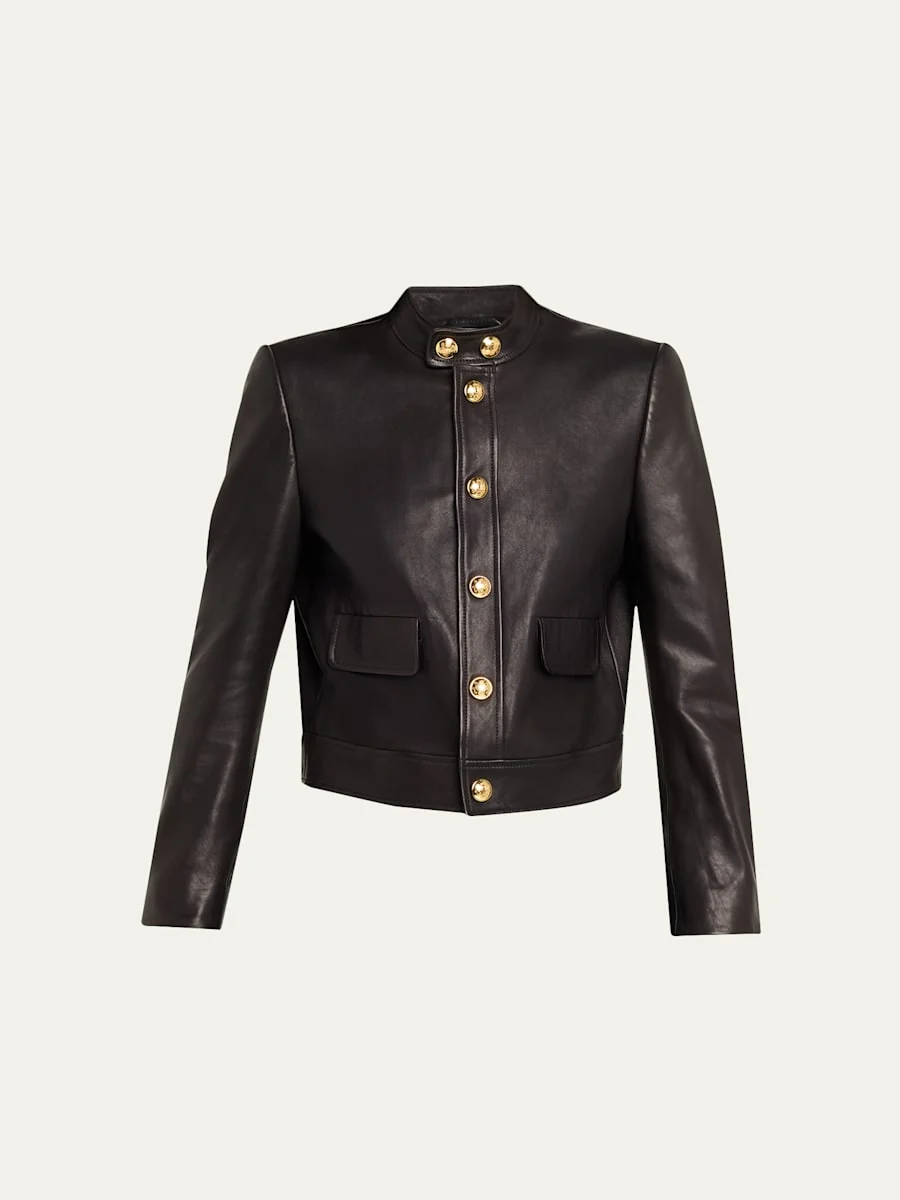 Crafted fromsupple lambskin leather, the "Hadley" jacket from Nili Lotan features signature crestengraved goldtone buttons and structured shoulders Stand collar; singlebreasted front Long sleeves; snapbutton cuffs Padded shoulders Hip flap pockets Straight fit Cropped length Snapbutton closure Leather Imported