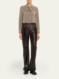 Nili Lotan "Irina" top is crafted of fluid silk with a striped print and features a neck tie detail Band collar; button front Long sleeves; button cuffs Yoked back Relaxed fit Hip length Silk Made in USA