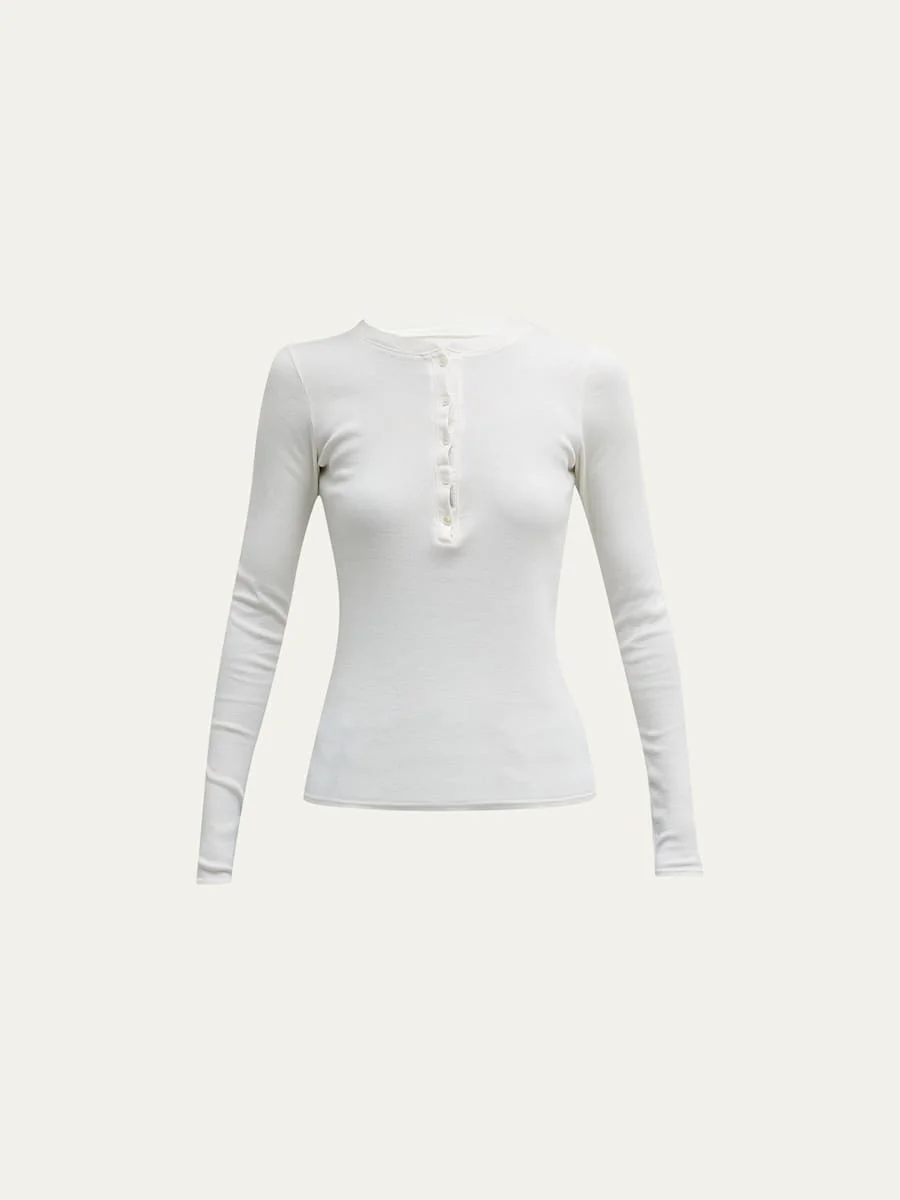 Nili Lotan "Jordan" henley T-shirt featuring a half button front Crew neckline; split V front Long sleeves Fitted Pullover style Cotton Dry clean Made in USA Model is 5'10"/177cm. Online Inquiries: BGS21_B87UN| Store Inquiries: #4485129