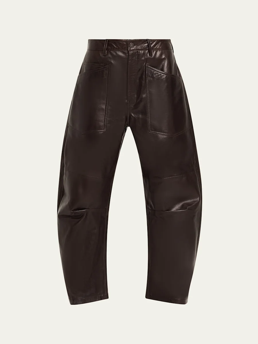 Nili Lotan "Shon" barrel pants in shiny lambskin leather with knee pleats creating a curved leg Mid rise sits high on hip Front and back patch pockets Curved legs Cropped at the ankle Button/zip fly; belt loops Leather Imported Online Inquiries: BGS21_BA70D| Store Inquiries: #5043677