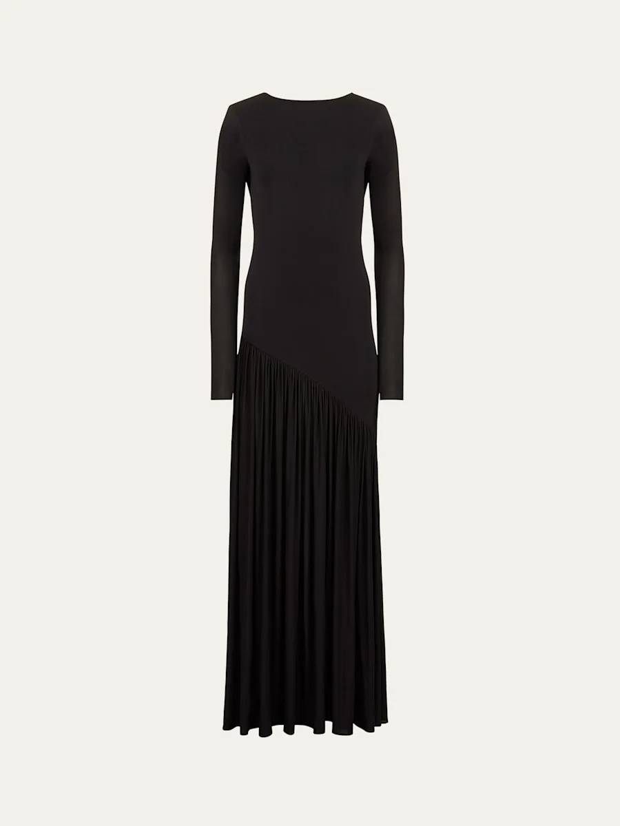 Asymmetric Plisse Stretch Jersey Long-Sleeve Maxi Dress