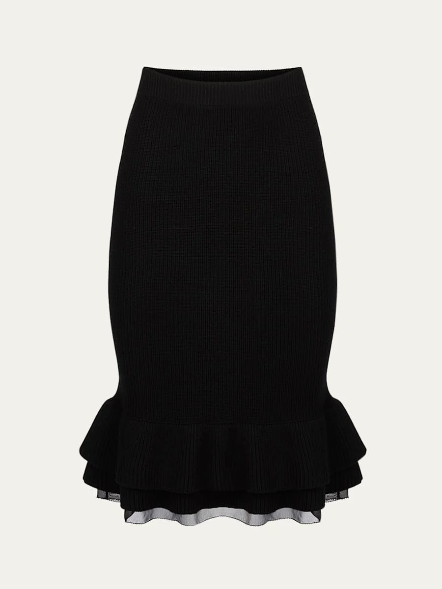 Nina Ricci ribbed knit skirt featuring a tiered ruffled hem with a silk layer High waist Hem falls below the knee Pencil silhouette Pull-on style Wool/silk Imported Online Inquiries: BGS21_BA6Z7| Store Inquiries: #5043277
