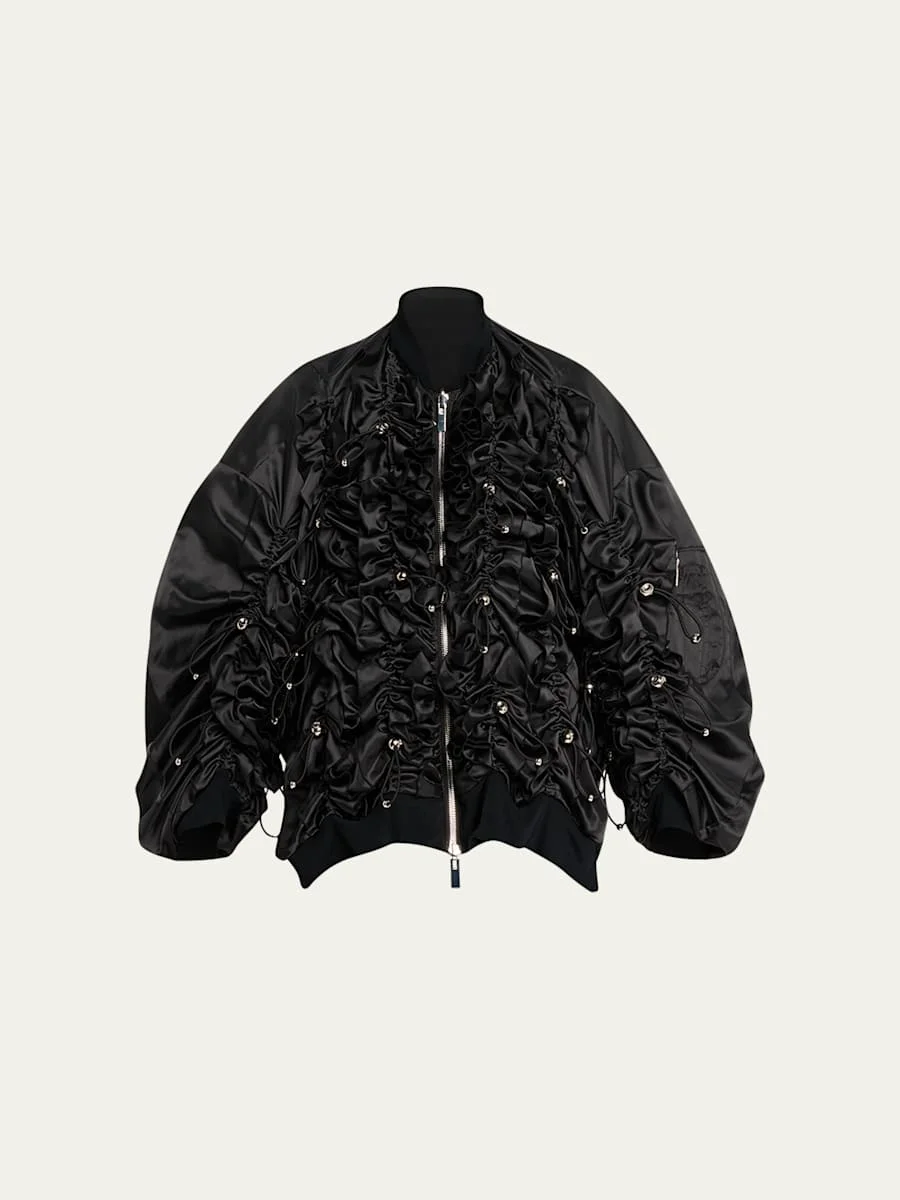 This satin bomber jacket by Noir Kei Ninomiya is finished with romantic ruffles and drawcords threaded with silvery baubles Baseball collar; twoway zip front Dropped shoulders Long sleeves; elastic cuffs Zipped pocket at left sleeve Relaxed fit Hip length Polyester Made in Japan