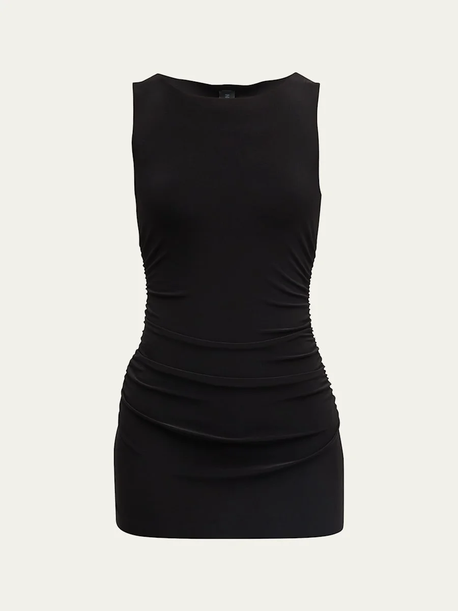 Norma Kamali pickleball dress with a built-in stretch bodysuit and clean-cut edges Crew neckline Sleeveless Shirred sides Bodycon fit Mini length Pullover style Polyester/spandex Imported Model is 5'10"/177cm. Online Inquiries: BGS21_T4FE9| Store Inquiries: #4486368