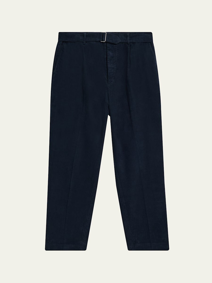 Officine Generale pants in soft corduroy, defined by an adjustable self-belt High rise Single-pleated front Side slip pockets Back flap pockets Relaxed fit through straight legs Full length Zip-fly; belt loops Cotton/elastane Unlined Machine wash Imported Online Inquiries: BGS21_NDMBY| Store Inquiries: #5047979