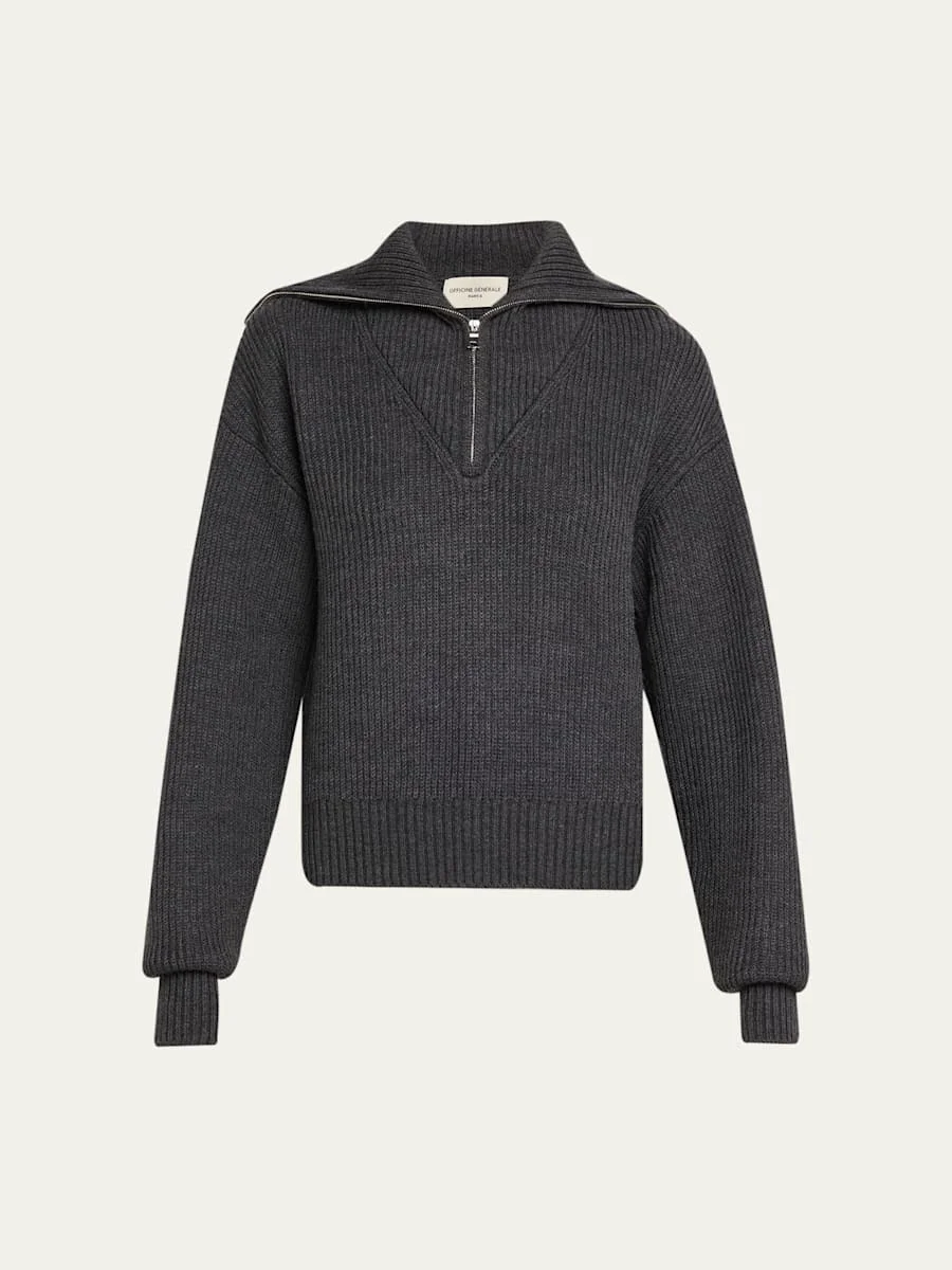 Knitted in cozy merino wool, the "Vera" sweater by Officine Generale features a quarter zip front with a luxurious look and feel. Funnel neckline; zip closure Dropped shoulders Long sleeves Relaxed fit Hem sits at the hip Pullover style Wool Machine wash Imported