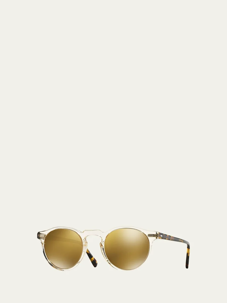 Oliver Peoples "Gregory Peck" acetate sunglasses inspired by the frames worn by Gregory Peck in the classic film To Kill A Mockingbird. Classic P3 lens shape; keyhole nosebridge. Photochromic lenses. Horizontal pins on frame front and temples. Eyes/bridge/temple (in mm): 47/23/150. Made in Italy. Photochromic lenses:Are UVsensitive. Will selfadjust to darker or lighter conditions for the sharpest vision possible. Feature antireflective coating to eliminate bounceback glare from the inside surface of the lens into the eyes. Include the iconic Oliver Peoples breath logo to assure authenticity.