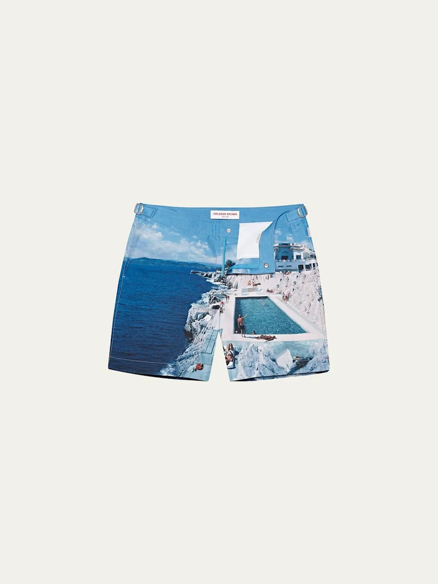 Orlebar Brown "Bulldog" swim shorts in photographic print Signature side adjusters Concealed snap closure Front slash pockets Single back zip pocket Mid length Polyester Nylon mesh lining Made in Portugal Model is 6'1"/185cm. Online Inquiries: BGS21_NC75U| Store Inquiries: #4822646