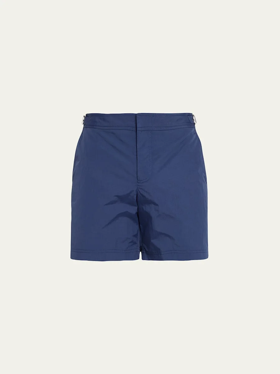 Orlebar Brown "Bulldog" swim shorts in durable nylon fabric Approx. 6" inseam Snap-zip front Regular rise; flat front Adjustable straps at sides Side slant pockets Vented sides Classic fit Polyamide Nylon lining Machine wash cold Made in Portugal Model is 6'1"/185cm. Online Inquiries: BGS21_N9N2P| Store Inquiries: #4352698