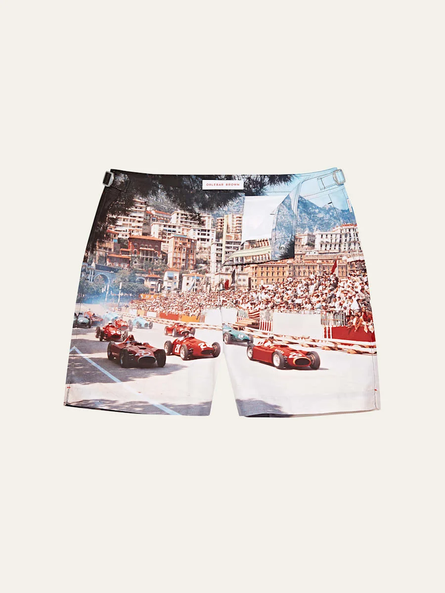 Orlebar Brown "Bulldog" swim shorts in photographic print Approx. 6" inseam Signature adjustable side fasteners Snap front closure Angled side pockets Single back pocket with zipper Tailored mid-length fit Nylon mesh lining Polyester Machine wash cold Made in Portugal Online Inquiries: BGS21_NC7U8| Store Inquiries: #4826230