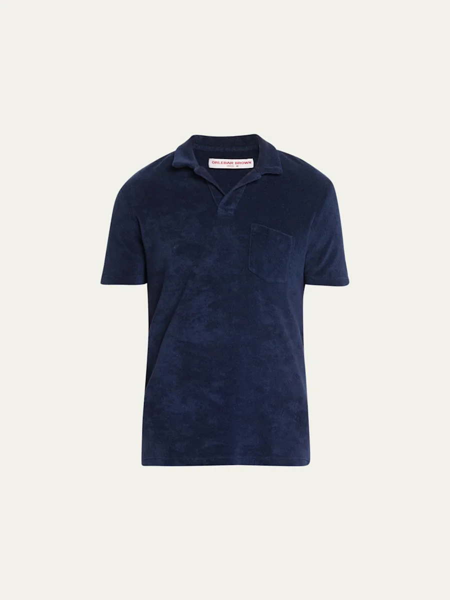 Orlebar Brown polo shirt in plush cotton terry fabric V-neckline Spread collar Chest patch pocket Short sleeves Pullover style Slim fit Cotton Made in Portugal Model is 6'1"/185cm. Online Inquiries: BGS21_N9N2L| Store Inquiries: #4352696